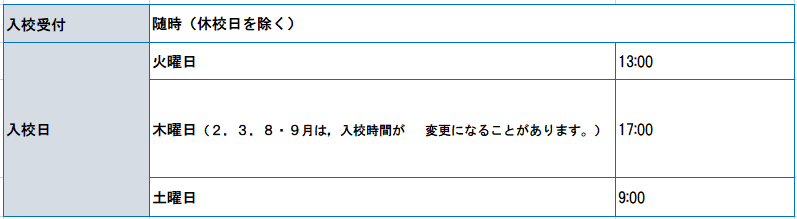 ※曜日によって入校時間帯が異なりますのでご注意ください。